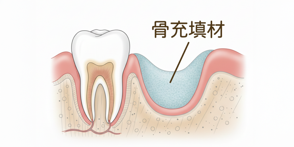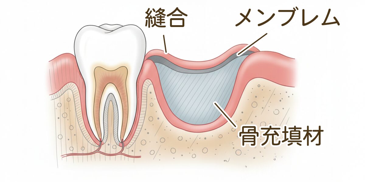 骨充填材には、自家骨(自分の骨)や人工骨が使われます。メンブレンには吸収性タイプと非吸収性タイプがあり、症例に応じて選択されます。