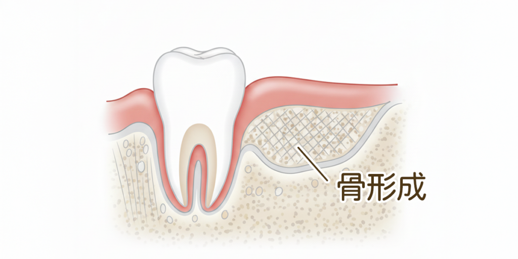 この膜が、歯ぐきの組織が骨の再生を妨げないようにバリアの役割を果たし、内部で骨細胞がゆっくりと新しい骨を作り出すのです。