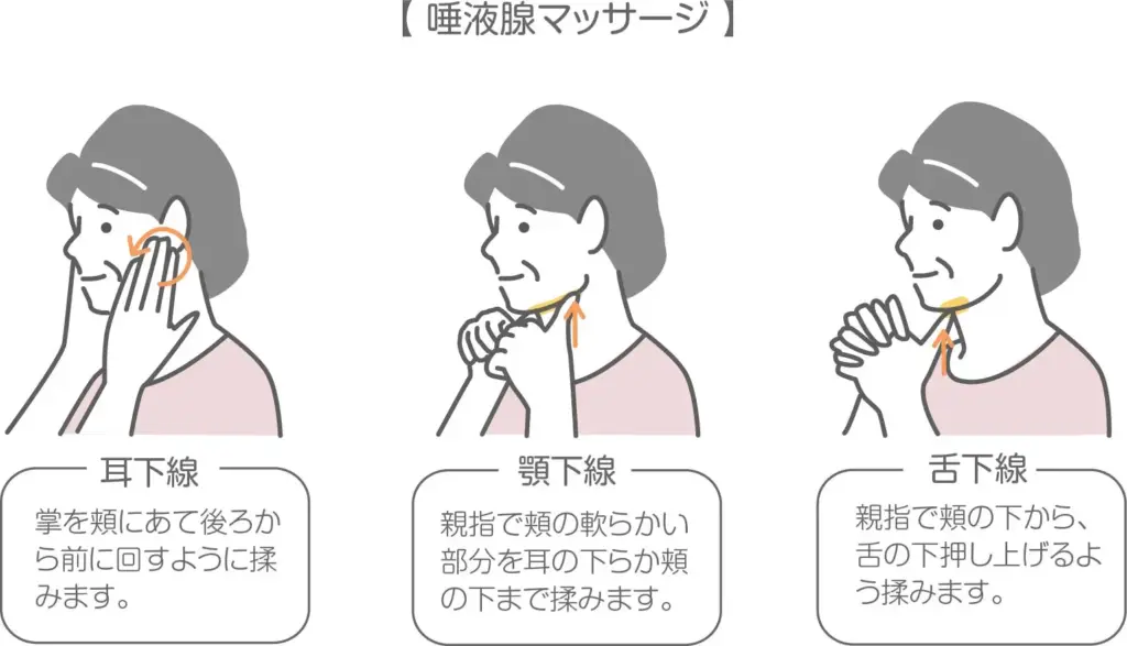 | 口の乾き・ねばつき | 唾液腺の働き低下 | 水分補給・唾液腺マッサージ |
