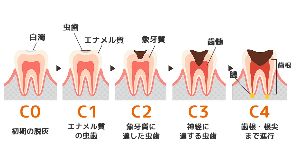 虫歯の進行度と治療法まとめ表(C0〜C4)