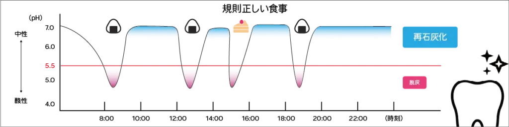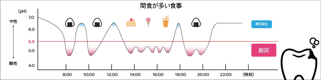口の中が酸性に傾く時間が長いほど、脱灰が進みやすくなります。